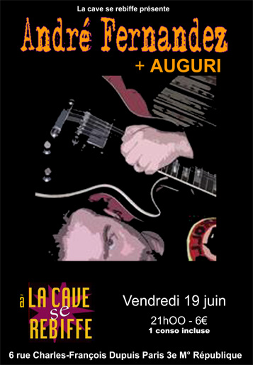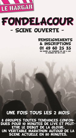 #Mai 2011 Pour la première fois en groupe !!! A la Scène ouverte le FOND DE LA COUR au Hangar d'Ivry Vendredi 10 juin 2011 avec Norbert Galo (guitare-choeurs) Nicolas Untersteller (basse) Frédéric Lucain (batterie) 20h00 - 5€ LE HANGAR 3-5, rue Raspail 94200 Ivry sur seine |